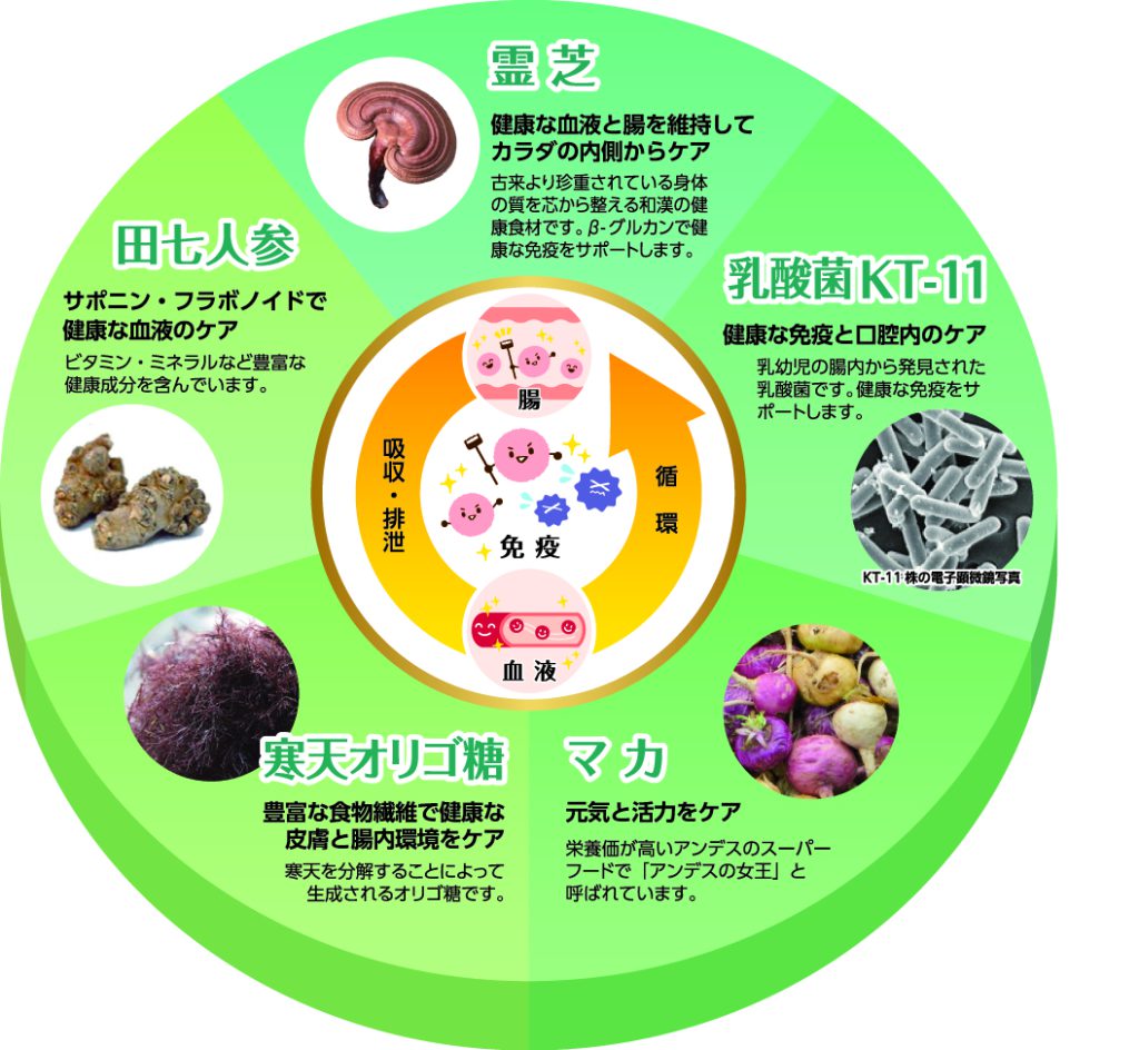 必須アミノ酸を含む18種類のアミノ酸やビタミン、ミネラルなどを含んでいます。 - 乳酸菌(殺菌)KT-11